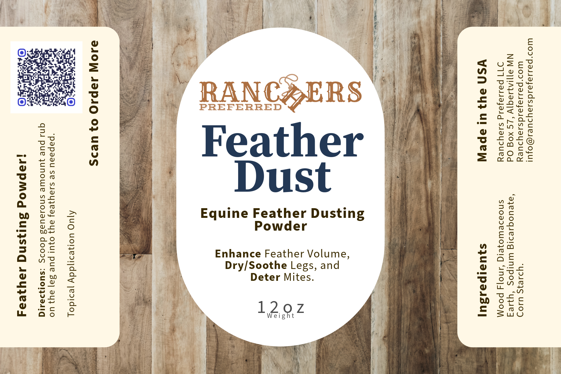 Ranchers Preferred Equine Feather Dust Powder is specially formulated to dry, fluff, and add volume to the leg feathers of horses and ponies. Made from naturally absorbent, silica-shelled fossilized diatoms and fine wood flour, this powder helps maintain hygiene by promoting dryness in the feathered areas. The dry environment created helps deter mites and other crawling insects.